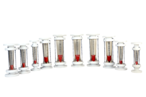 The rotameter’s operation is based on the variable area principle: fluid flow raises a float in a tapered tube, increasing the area for passage of the fluid. The greater the flow, the higher the float is raised. The height of the float is directly proportional to the flow rate. With liquids, the float is raised by a combination of the buoyancy of the liquid and the velocity head of the fluid. The float moves up or down in the tube in proportion to the fluid flow rate and the annular area between the float and the tube wall. The float reaches a stable position in the tube when the upward force exerted by the flowing fluid equals the downward gravitational force exerted by the weight of the float. A change in flow rate upsets this balance of forces. The float then moves up or down, changing the annular area until it again reaches a position where the forces are in equilibrium. To satisfy the force equation, the rotameter float assumes a distinct position for every constant flow rate. However, it is important to note that because the float position is gravity dependent, rotameters must be vertically oriented and mounted.